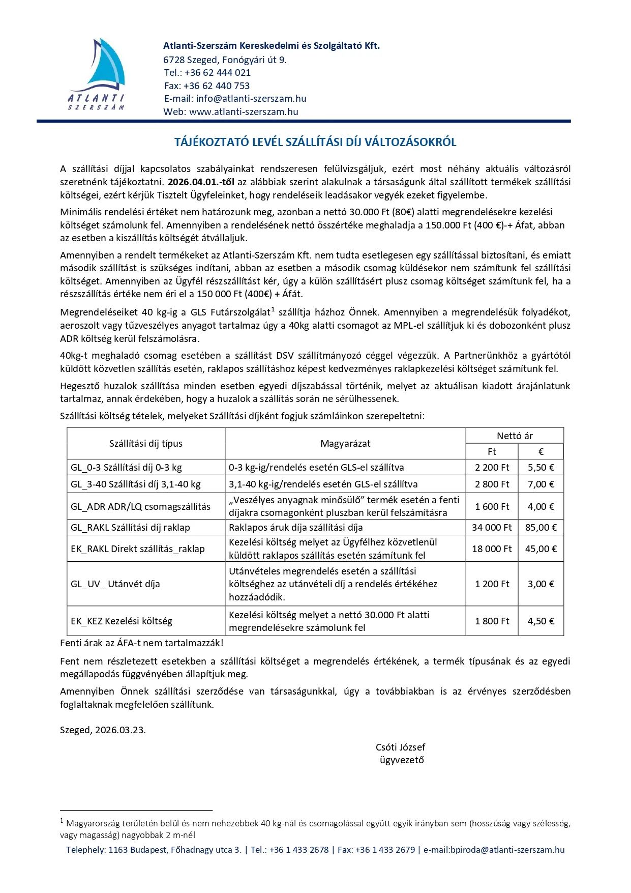 „Szállítási díj” tájékoztató:
